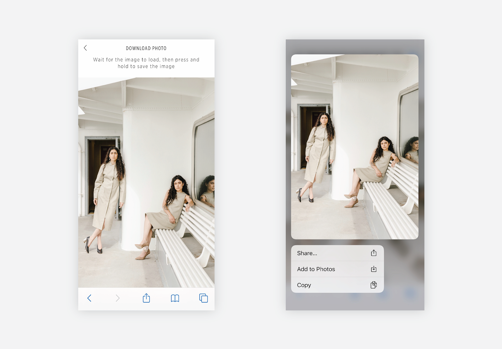 Press and hold each photo to download to your phone. Click Add to Photos to save the image to your photos folder. This step may vary for various mobile devices.